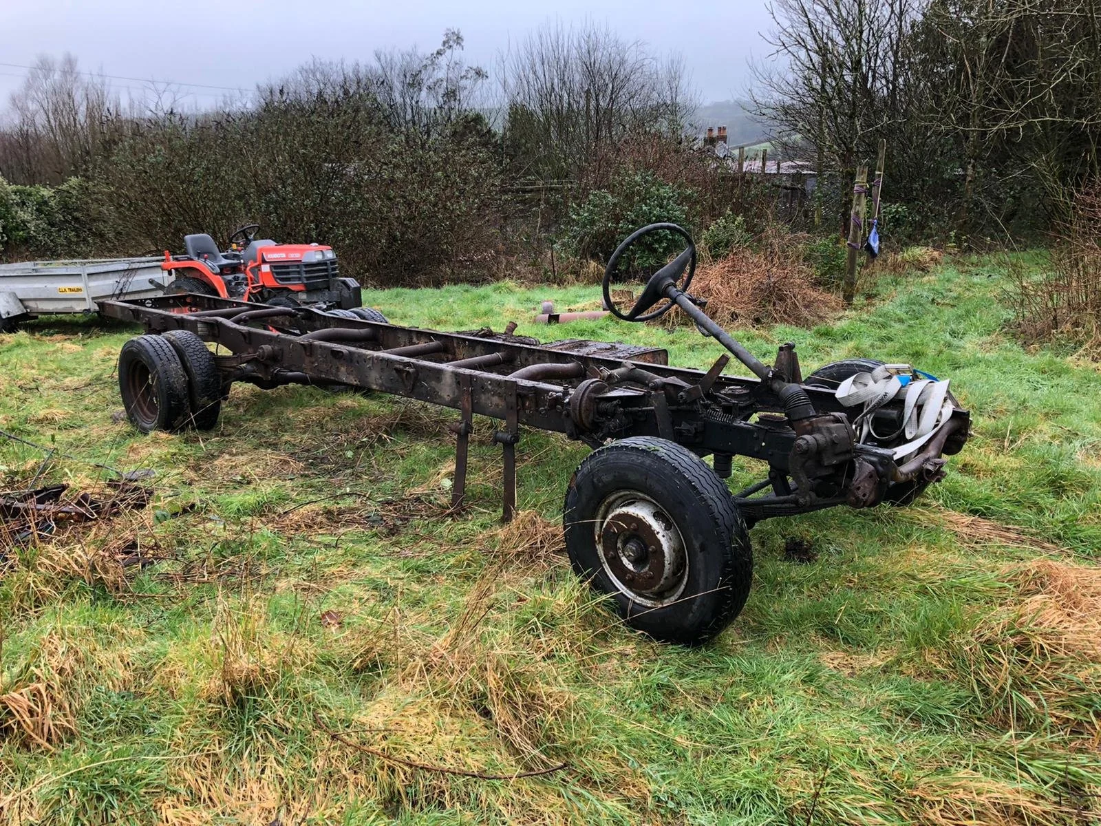 New gate fixed to the top of the drive to prevent sheep wandering down after a lorry demolished the last one. Lots of strimming around the place this month and a new fibre flooring laid down in the fruit cage for weed control. Also the old chassis was moved to a new place and cleaned up.