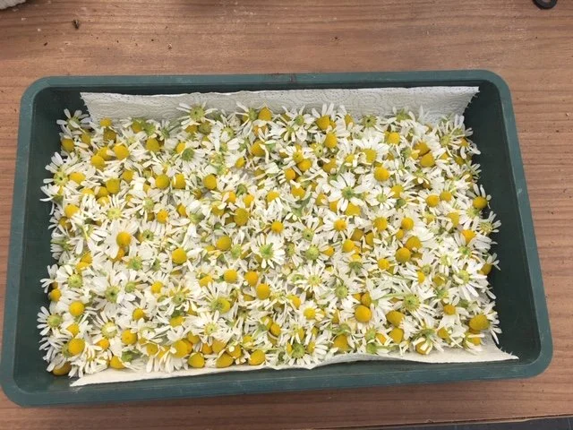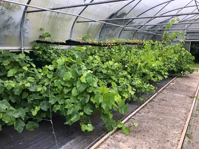 The fruit cage has encouraged our fruit bushes to produce a substantial quantity of raspberries, gooseberries, blackcurrants, white currants, redcurrants, blueberries and rhubarb which have all been prepared for the freezer. The grape vines are heavy with grapes this year. We had our first harvest of chamomile which will be dried and stored for tea. Some drainage work was done from the camping field down to the house involving a lot of digging! Strimming continues of Himilayan Basalm which is an invasive weed.
