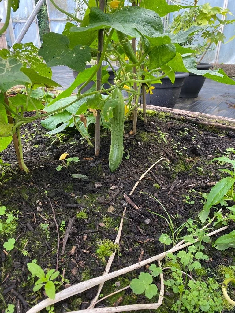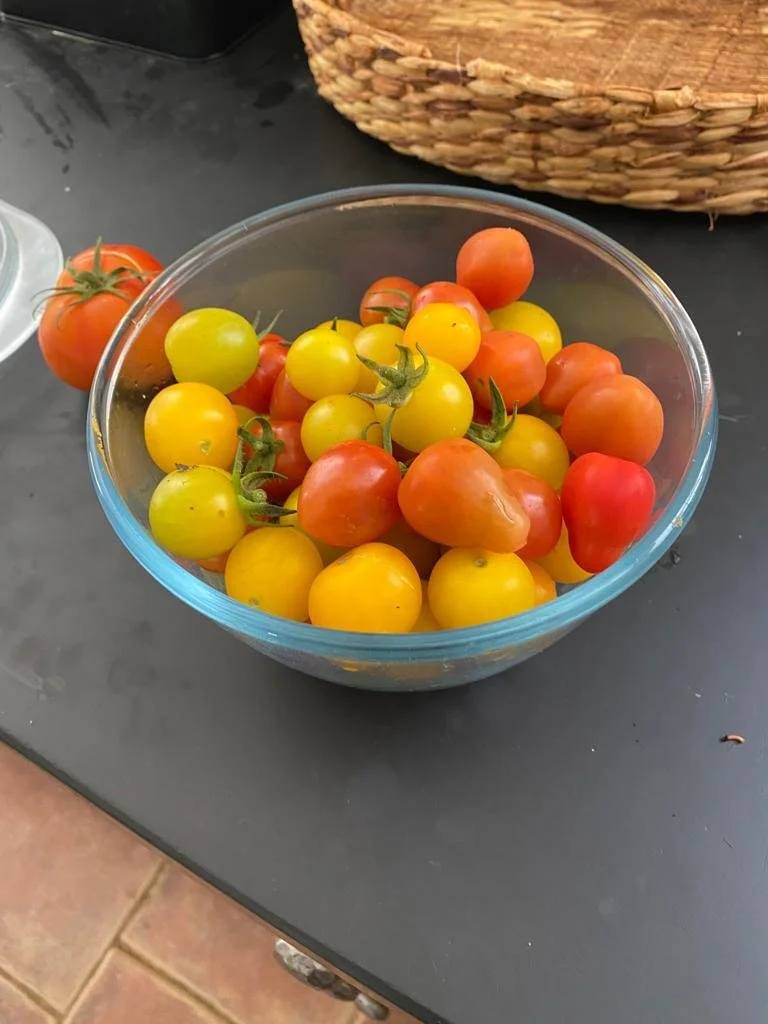 We are having a bumper crop of tomatoes and particularly like the small yellow variety. Also grew our first cucumber successfully and hope to save the seeds for next year