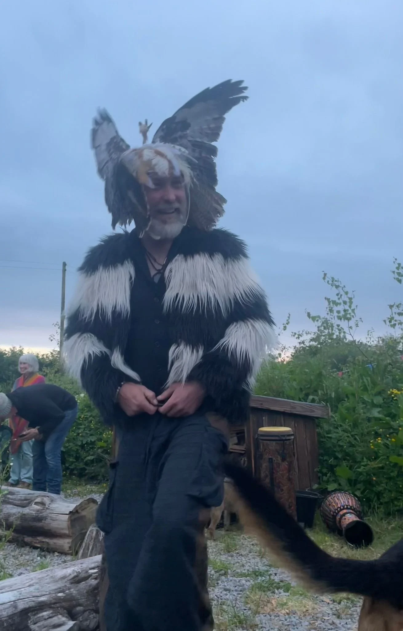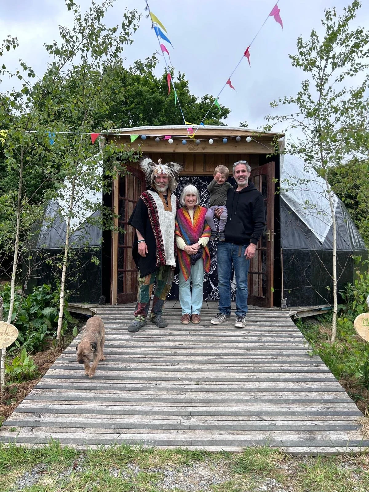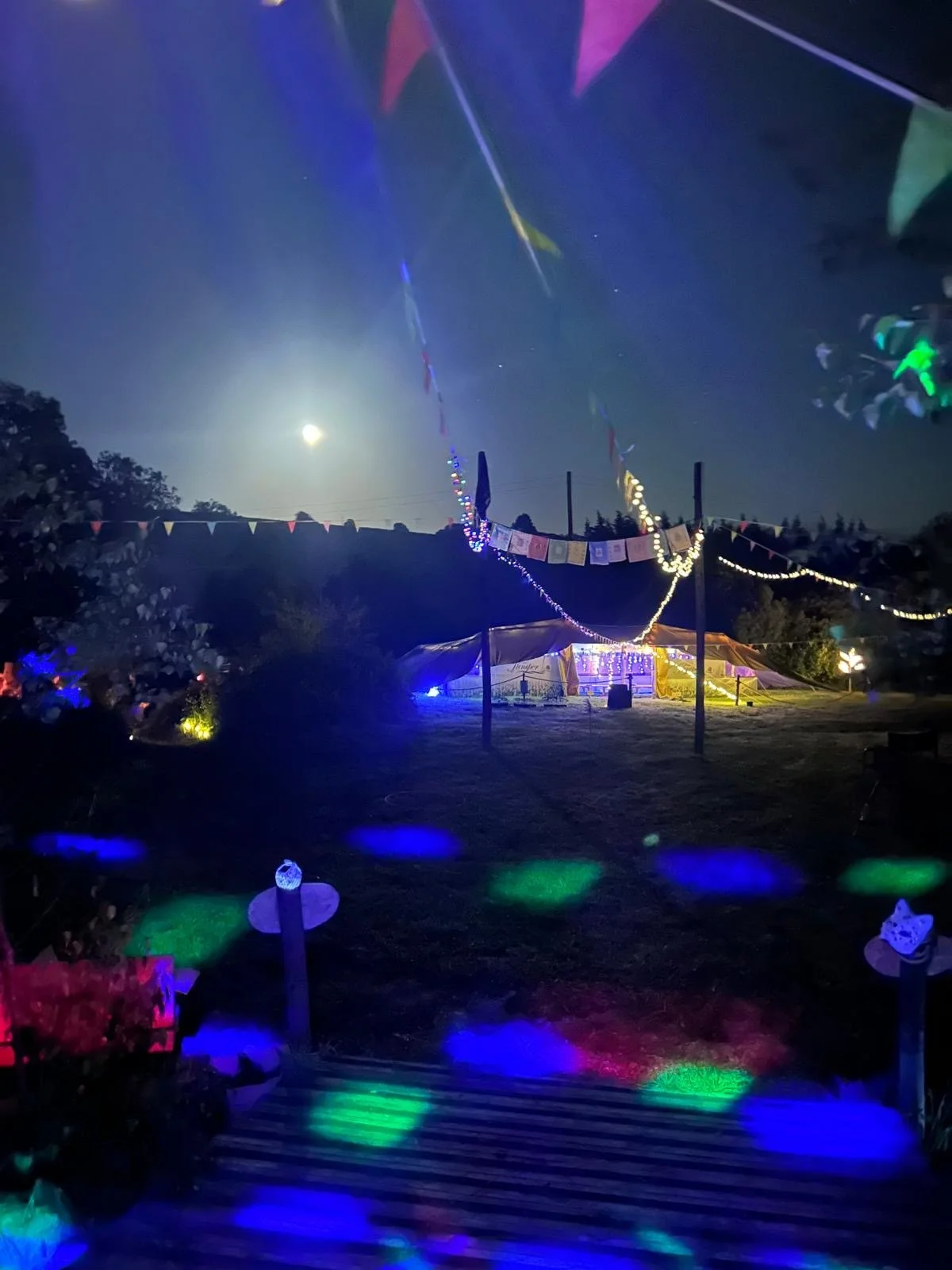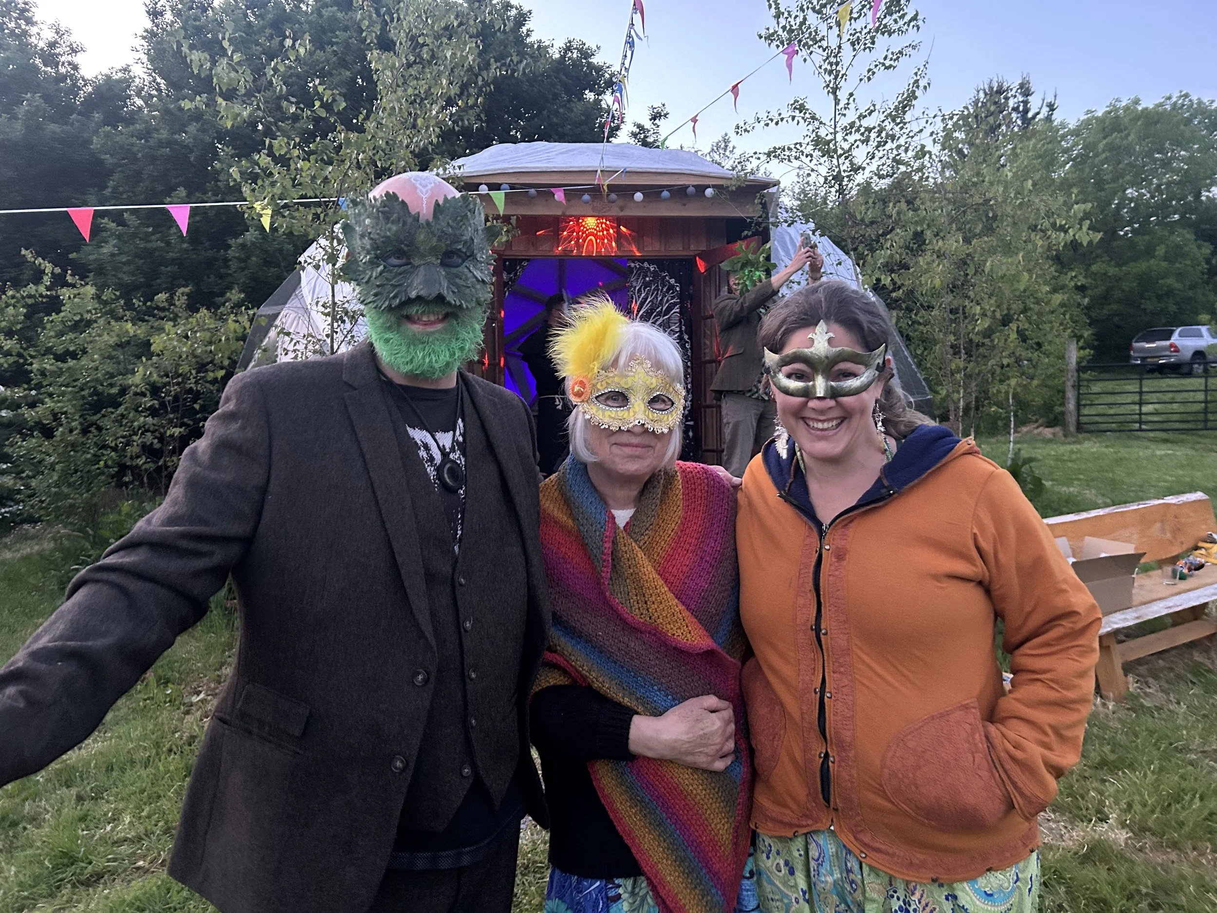Stuart celebrated his big birthday (40) over 4 days with an average of 30 people each day. An evening meal was offered each night in our camp kitchen. A big bonfire was made the first night with musical accompaniment from people there. A fancy dress party took place in the dome on Friday with some amazing costumes on display particularly Stuart’s headpiece made by his friend, Clare. Saturday was a chill out day with games and ended with a huge banquet/barbeque and cake enjoyed by all.